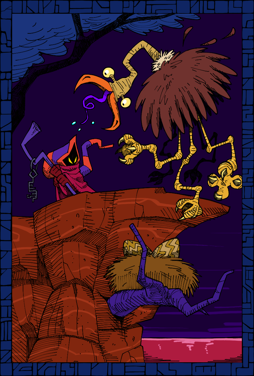 After a well-deserved berry break, you explore the forest further. Eventually, you exit on the other side, only to be met with a sheer cliff-face. Looking down, you notice a nest of some sort with two large eggs in it, as well as the key you were seeking dangling from the branch supporting the nest. Using a long, sturdy branch from a nearby tree, you are able to retrieve the key... however, you also encounter a bird that's less than thrilled with someone mucking about its nest, spitting and hissing in your direction. Dreadful creatures.